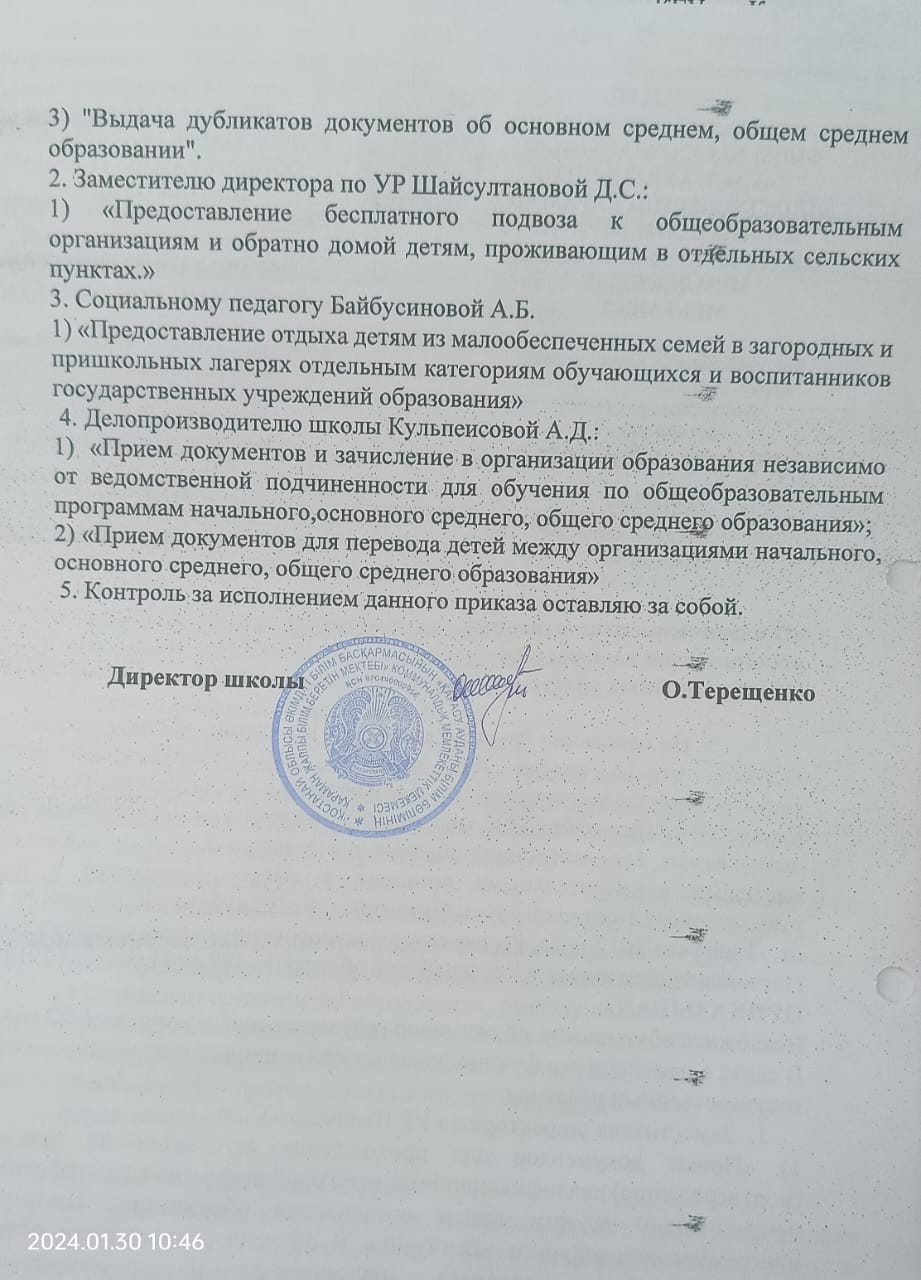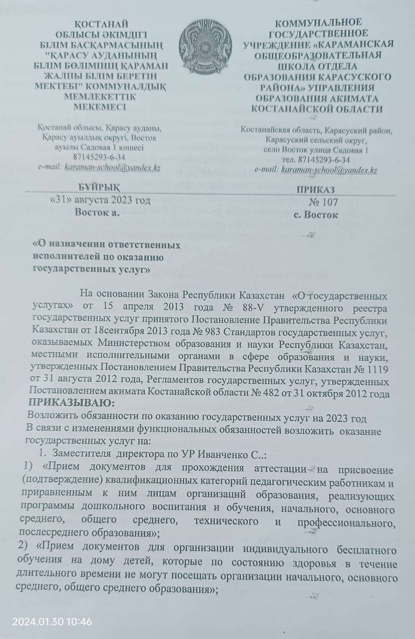 КГУ «Караманская общеобразовательная школа отдела образования Карасуского района» Управления образования акимата Костанайской области «Об оказании государственных услуг в сфере образования» 18 января 2024 года