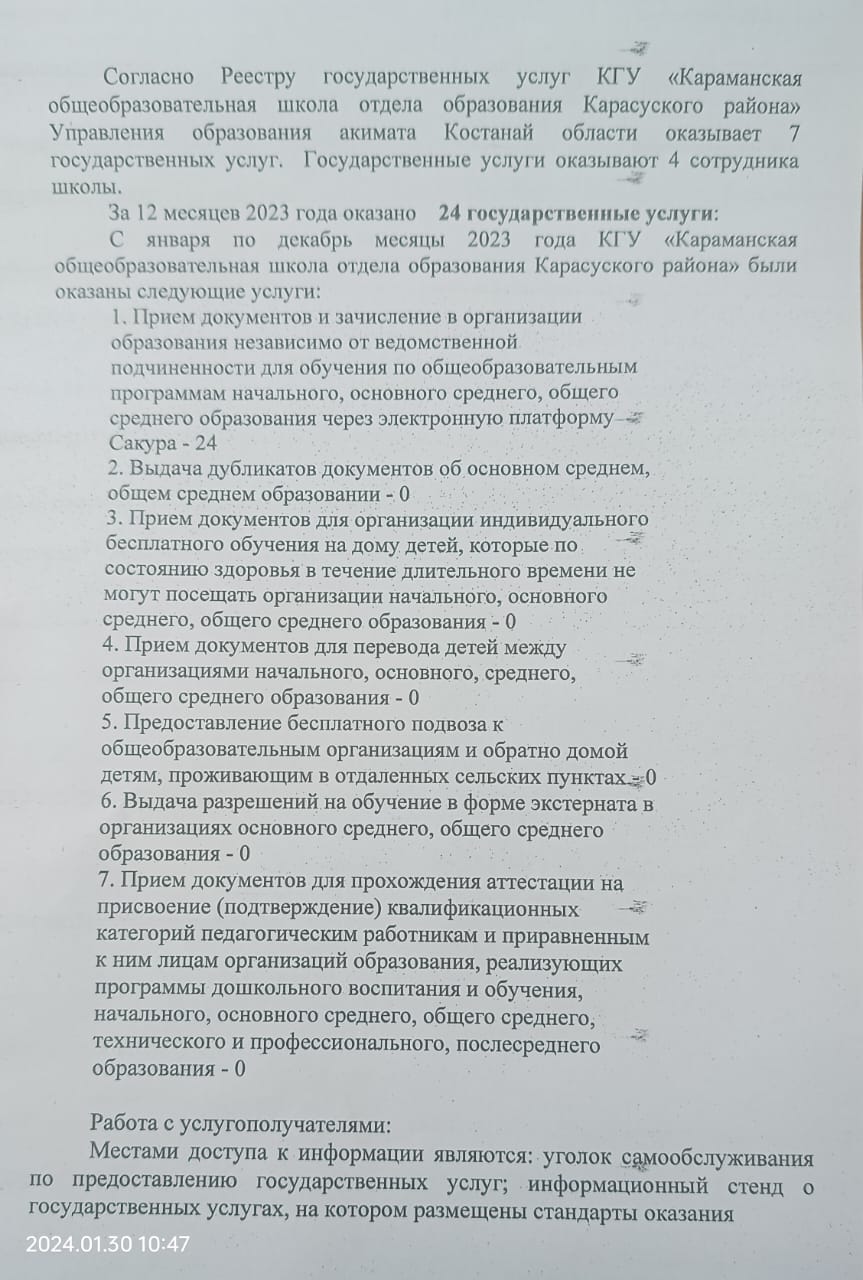 КГУ«Караманская общеобразовательная школа отдела образования Карасуского района» Управления образования акимата Костанайской области оказывает 7 государственных услуг в соответствии с реестром государственных услуг. Государственная услуга оказывается 2 работниками школы. За 12 месяцев в период с января по декабрь 2024 года были оказаны следующие государственные услуги: